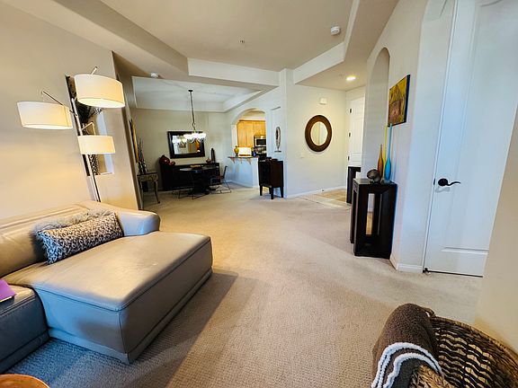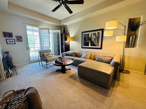 Two bedrooms plus den and two bathrooms furnished condo in luxurious gated Villa Portofino on the upper floor. This gorgeous condo is in the exclusive Palm Desert 55+ community. Immaculate unit comes with a fireplace, high ceilings, recessed lighting, plantation shutters throughout, travertine tile flooring and newer carpeting. Specious living room leads to the balcony with amazing views of the mountains. Den with a wet bar and built-ins could be a great office space or room for relaxation. The kitchen is well appointed with stainless steel appliances and granite countertops. Primary bath features a separate soaking tub and shower with dual vanity sinks and granite counters. There are large walk-in closets in both bedrooms and a separate area for washer and dryer. Unit located in close proximity to the elevator. ONE OF THE BEST CLUBHOUSES IN THE VALLEY. Relax and dine in the Villa Portofino's 30,000+ square foot clubhouse, enjoy fine dinning and free movies in the 100-seat theater, use billiard room, bridge room, library, conference room, concierge, Olympic size pool and spa, complimentary yoga, and a lot of other activities. Villa Portofino community located close to El Paseo drive dinning and shopping, groceries stores and medical facilities. The condo is ready use as rental right away.