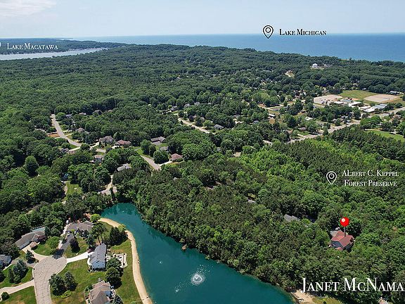 Discover this beautifully updated and spacious home nestled on 2.4-acres adjacent to a nature preserve and a stone's throw to Tunnel Park, Holland State Park, Lake Michigan, marinas, bike paths, and walking trails. This home offers the perfect blend of privacy and location! The heart of the main floor is the spacious kitchen featuring a large island, solid surface counters, tile backsplash and stainless appliances. An adjacent dining space opens to the light-filled living room with a fireplace and sunny three season porch perfect for your morning coffee. The porch leads to an expansive deck with views of Mallard Pond and the private yard. Completing the main floor is a mudroom entry off the garage, a large office/den with built-ins and a convenient half bath. Upstairs you will find the large primary suite with fireplace, walk-in closet and luxurious bathroom plus three additional bedrooms each with its own bath, and laundry. The finished lower level provides two additional bedrooms, one currently a work-out room, two full baths, family room with built-ins and additional laundry room. A perfect space to relax, host, or play! Additional features include a whole-house generator and water treatment and filtration system. This is a rare opportunity to own a beautifully updated home in a premier location near Lake Michigan beaches and parks.Don't miss it!