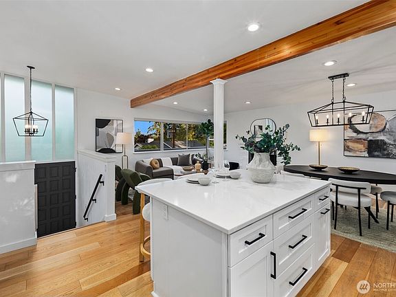 Stunning mid-century remodel in sought-after Lochmoor with sweeping Cascade views and an open, light-filled design. The heart of the home is a modern kitchen with quartz counters, stainless appliances, and an induction cooktop, seamlessly blending style and function. Recent upgrades include newer windows, A/C, furnace, PVC roof, garage doors, waterproof engineered hardwoods, plus refreshed baths, electrical, water heater, doors, and hardware. The lower level offers a spacious bonus room with a cozy fireplace. Outside, enjoy a private fenced backyard and deck. All within the top-rated Bellevue School District and close to Crossroads, parks, shops, dining, and major freeways.