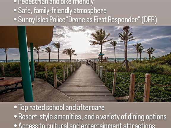 1 block from the beach! Fast approval...2 bed 2 bath, Rent includes covered garage, pool, cable, water, and internet. Walk to restaurants, shops, and school. Large Double Balcony with Pool View Pristine beaches, vibrant parks & recreation Pedestrian and bike friendly Safe, family-friendly atmosphere Sunny Isles Police"Drone as First Responder" (DFR) Top rated school and aftercare Resort-style amenities, and a variety of dining options Access to cultural and entertainment attractions Convenient location between Miami & Ft Lauderdale