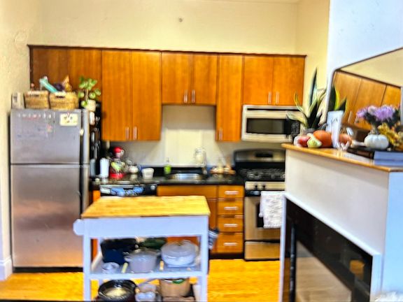 Gas fireplaceHistoric brick buildingLots of lightStunning woodworkCherry cabinetsHardwood floorsStainless appliances