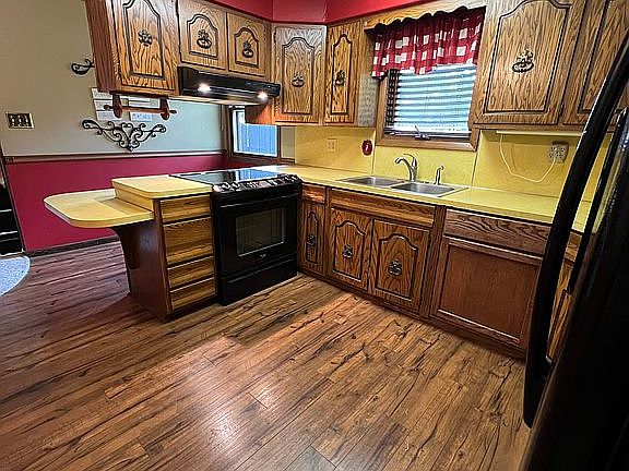 Enjoy cooking in the kitchen with its eat-at counter space and a unique built-in drink cart cleverly tucked into the cabinetry. The black slide in range and refrigerator work properly and come with the purchase. Bonus, there is a spacious pantry . The sunken living room creates a cozy atmosphere, complete with a wood-burning fireplace for those cooler nights.