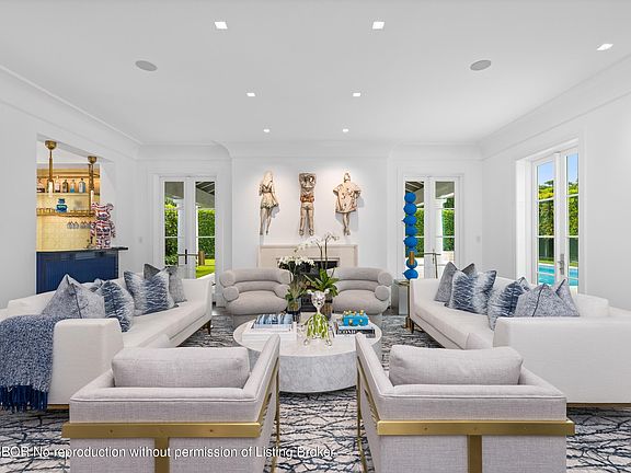 Stunning and pristine 5BR/5.2BA beautifully remodeled Georgian home with 7,500+/- square feet. Gorgeous and sophisticated marble and hardwood finishes throughout. Thoughtful interior design by Kenny Alpert. Immaculate landscaping surrounding fabulous backyard with resort-style pool, spa, and oversized loggia with fireplace. Living room features fireplace and stunning bar with wine fridges. Top-of-the-line eat-in kitchen with chef's island, wine fridge, and beautiful detailing. Sunny library with built-in shelving. Soaring ceilings, impact windows, and generator. Fantastic Estate Section location with beach access.