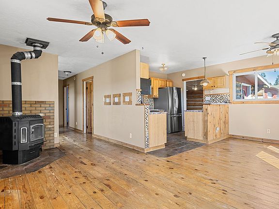 The home features rustic wood floors, a cozy wood stove, and an inviting layout with updated kitchen appliances. Step outside to find an three-car garage, multiple outbuildings, and a red barn with stalls, ideal for horses or livestock. Pastures are fenced, with rolling hills, and mature trees that capture the essence of Montana living.