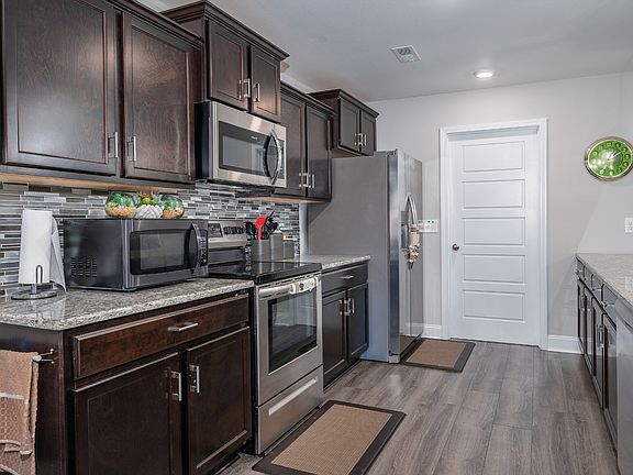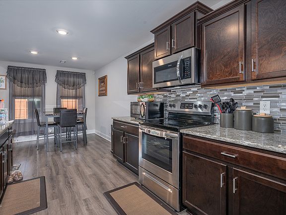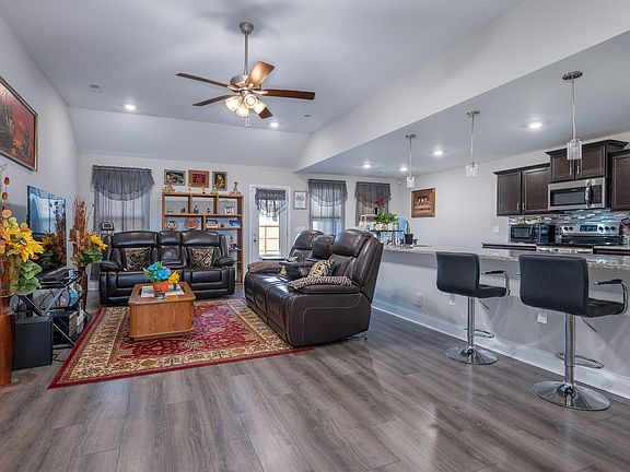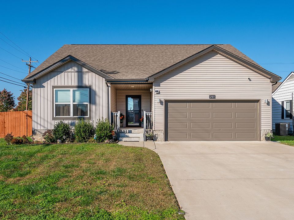 Like-new single-level home with concrete drive and 2-car front-entry garage. Welcoming covered front porch leads into an open floor plan connecting the kitchen, living, and dining areas with a high ceiling in the living room. The kitchen features granite countertops, stainless appliances, rich cabinetry, and center-island seating. The primary suite includes a spacious tile shower and double vanity. Enjoy outdoor living on the covered patio overlooking a large, privacy-fenced backyard. Near entrance for Fort Campbell!
