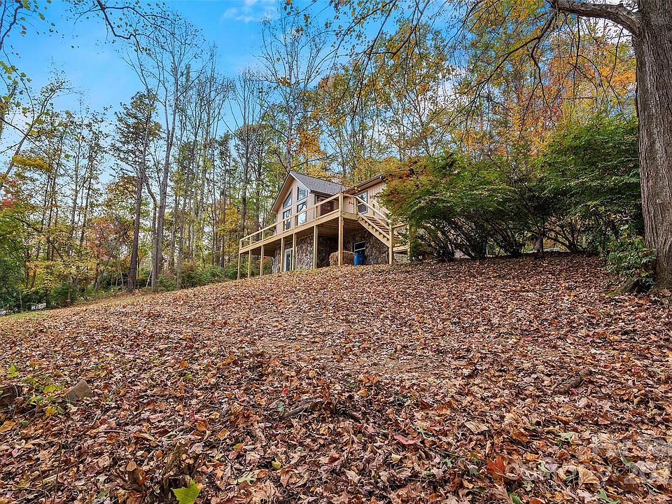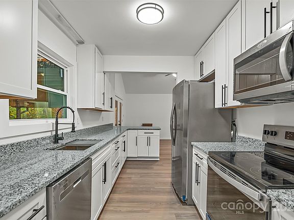 Discover your dream Asheville lifestyle in this beautifully renovated contemporary home, nestled within the highly sought-after Pioneer Trails community. Perfectly positioned in the desirable Bee Ridge/Avondale area, this property offers unparalleled convenience – just 10 minutes from vibrant downtown Asheville, moments from the scenic Blue Ridge Parkway, and mere minutes to major shopping, dining, and essential amenities. Enjoy the best of both worlds with a prime location just outside city limits, benefiting from lower county taxes. Situated on a generous 1.01-acre private lot, the mostly wooded surroundings provide a serene escape with lovely winter mountain views. Outdoor living shines with a huge, brand-new full-length open front deck perfect for entertaining, complemented by a large 19' x 20' covered rear porch ideal for relaxing family meals or offering future screening or expansion possibilities. Step inside to find a home transformed by extensive recent renovations, leaving nothing left to do but move in. Updates include fresh exterior paint, a new architectural roof, the stunning new front deck, a newer heat pump/AC system, durable new vinyl plank flooring throughout, fresh interior paint, and new vinyl insulated windows. The heart of the home is the completely new kitchen, boasting stainless steel appliances, gleaming granite countertops, and a convenient eat-in bar. Further enhancements include a new side deck, stylish new light fixtures, new interior and exterior doors, new garage doors, beautifully updated bathrooms, and a new whole-house water filtration system. Cathedral ceilings soar over the open living and dining areas, bathing the space in natural light that extends seamlessly onto the large covered rear porch. A massive stone woodburning fireplace anchors the living room, creating an inviting and cozy atmosphere perfect for mountain evenings. The thoughtful split-bedroom design features three bedrooms and two full baths, ensuring privacy. The large primary suite opens directly onto the new front deck, plus offers a spacious walk-in closet with a custom barn door and a private en-suite bath. Conveniently located off the kitchen, the main level laundry room also serves as a large walk-in pantry and leads out to the new open side deck. Adding fantastic versatility, the daylight basement offers an additional 635 sq ft of finished, heated space featuring a family room and a full bath, presenting excellent potential for a media room, home office, or guest suite (this space was finished without permits, not counted in total square footage). The large two-car basement garage provides ample storage with tandem parking possibilities on one side, while the other side is best suited for a compact vehicle. Don't miss this opportunity to embrace a fully updated, private retreat offering exceptional convenience and modern comfort, ready for you to start creating lasting memories.