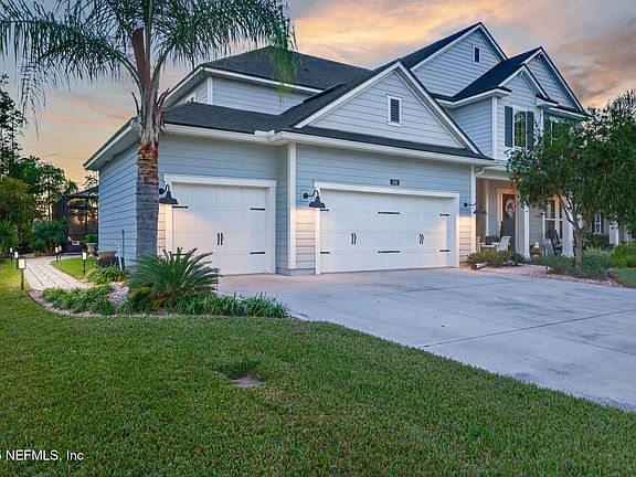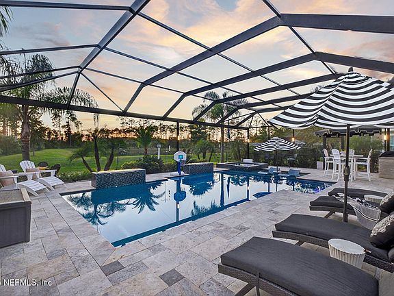 Step into a home that immediately feels extraordinary. This five bedroom three and a half bath Providence Custom Home offers 3,717 square feet of refined luxury on a quiet cul de sac with wide pond views and sunsets that look like a postcard. Every space feels intentional from the soaring ceilings to the rich tile plank flooring and custom designer touches throughout.The great room centers around a beautifully crafted entertainment wall and flows into a gourmet kitchen that truly stands out. Quartz countertops, a large island, stainless steel appliances, ivory cabinetry with uppers, tile backsplash, walk in pantry, remote controlled shades, and custom curtains create a warm upscale feel you notice right away.Indoor and outdoor living merge seamlessly as the sliders open to a private screened resort level oasis. A heated saltwater pool and spa shimmer with fire features, a waterfall, and a sun shelf. The upgraded summer kitchen, wide paver deck, and separate fire pit area invite you to slow down and enjoy the view. The backyard is framed with mature trees, professional landscaping, and custom lighting that makes evenings unforgettable.The first floor primary suite feels like a boutique hotel with a free standing soaking tub, large walk in shower, custom mirrors, and a spacious closet. A dedicated office with French doors adds a touch of elegance. The half bath features a full tiled accent wall and the laundry room includes a sink and custom shelving.Upstairs offers generous bedrooms with custom closets and a beautiful bonus room complete with added cabinetry and a built in refrigerator. Lighting and ceiling fans throughout the home were upgraded well beyond the builder package.The garage is a showpiece of its own with epoxy flooring, and pull down attic access for excellent storage.This property offers true luxury living with thoughtful upgrades, timeless design, and an outdoor experience that feels like your own private resort in the heart of St Johns.