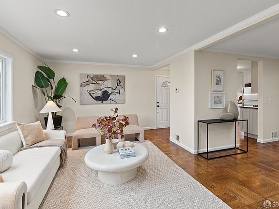 Spectacular, spacious, and semi-detached four-bedroom, two bath home showcasing a corner lot, stirring views and set in an ideal Sunnyside location! The main level opens to a coveted open floor plan featuring a large living room with fireplace, inviting dining area with skylight, and an updated gourmet eat-in kitchen all with gorgeous wood floors and cascading natural light. There are two bedrooms that both overlook the garden/patio/backyard and a full bathroom on this level. The conveniently located hallway leads to the comfortable lower level of the home with two additional bedrooms, an entertainment room, a full bathroom, wood floors, separate access, all graced with plenty of natural light, and done with permits. The yard space is both special and unique for San Francisco while offering a park-like setting, privacy, and the potential for longer term parking spaces. Do not miss this sophisticated home with too many upgrades to list that is close to shopping, restaurants, cafes, public transportation, HWY 101/280 and more!
