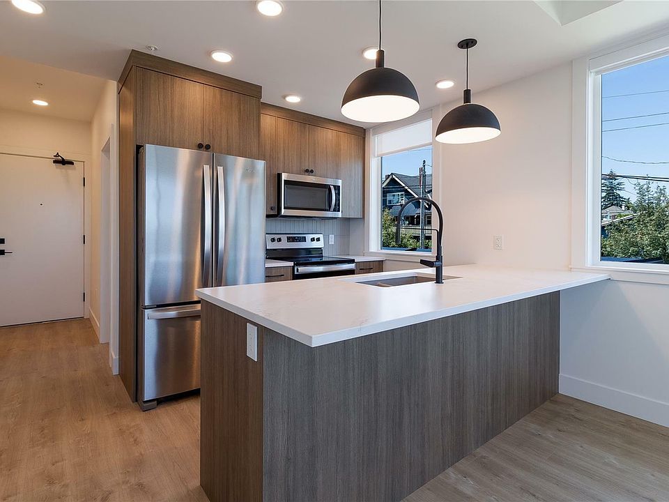 Welcome to Dalby's on Dogwood, where luxury meets convenience in the heart of Ladysmith, BC. This exclusive residence offers a blend of sophisticated design, modern amenities, and a prime location, ensuring an exceptional living experience for residents of all ages. The architectural beauty is complemented by breathtaking panoramic views of the harbour, providing a picturesque backdrop to daily life. This boutique 5-storey building offers 25 residences, each meticulously designed for comfort and functionality. Enjoy secure parking, a sleek lobby, and a common roof deck patio. Dalby's on Dogwood caters to your lifestyle with amenities like bike storage, a dog washing station, and lush landscaping. Embrace coastal living while still enjoying urban conveniences, just minutes from beaches, parks, and shops. This 1 bed, 2 bath home offers high-end finishes, in suite laundry, included appliances, window coverings and ocean views from your living and bedroom. Book your private showing today!