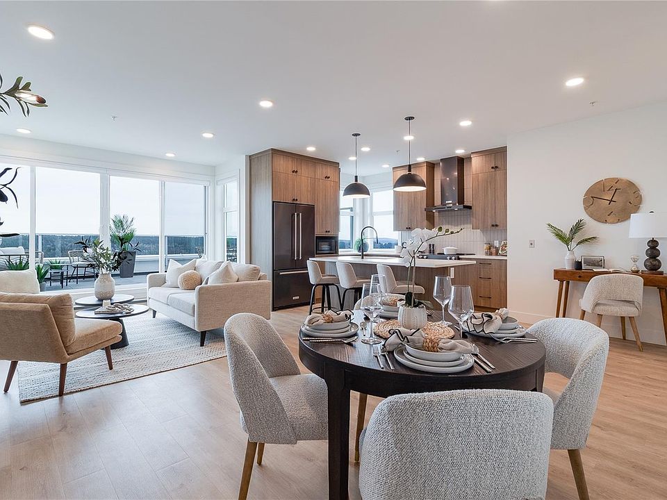 *PENTHOUSE UNIT* Welcome to Dalby's on Dogwood, where luxury meets convenience in the heart of Ladysmith, BC. This exclusive residence offers a blend of sophisticated design, modern amenities, and a prime location, ensuring an exceptional living experience for residents of all ages. The architectural beauty is complemented by breathtaking panoramic views of the harbour, providing a picturesque backdrop to daily life. Enjoy secure parking, a sleek lobby, and a common roof deck patio. Dalby's on Dogwood caters to your lifestyle with amenities like bike storage, a dog washing station, and lush landscaping. Embrace coastal living while still enjoying urban conveniences, just minutes from beaches, parks, and shops. This 2 bed, 2 bath home offers high-end finishes, in suite laundry, included appliances, window coverings and TWO private ocean view rooftop patios as well as a mountain view balcony. Book your private showing today! Can be purchased with furniture.