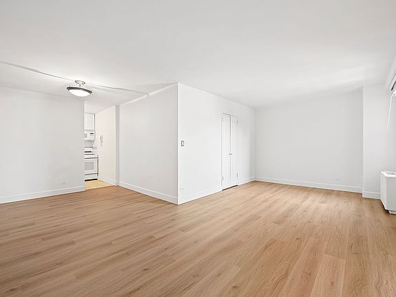 Inside you'll find new floors, fresh paint and wide windows facing north and east. The oversized alcove studio layout has already been converted for your convenience, with double glass doors opening to an inviting sleeping area. The dining foyer and long living room provide plenty of room for lounging, entertainment and working from home, while two extra-large closets deliver exceptional storage. Put your personal stamp on the bathroom and convenient kitchen layout that can easily be expanded and opened up to add an island. Two HVAC units ensure year-round comfort in both the living area and bedroom.
