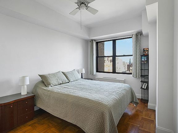 This bright and airy apartment features a wall of east-facing windows that offer expansive views stretching into Brooklyn, filling the living and bedroom spaces with natural light. The open-concept kitchen is generously sized and equipped with stainless steel appliances, ample storage, and a convenient breakfast bar. The bedroom comfortably fits a queen-sized bed and includes a spacious walk-in closet. The renovated bathroom boasts elegant fixtures from Toto and Kohler.