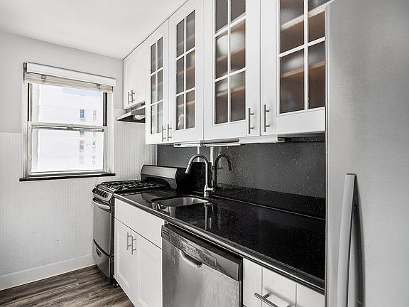 Your journey begins in an elegant, formal foyer lined with dual closets. This leads you into a vast living and dining area. The primary bedroom comfortably fits a king-sized bed and additional furniture, complemented by a large closet and dual windows facing east and south. Adjacent to the primary bedroom is a renovated, windowed bathroom. The living room is currently configured to include a living/dining space and an additional bedroom, capable of accommodating a queen bed and more, all illuminated by southern light and views. The separate, windowed galley kitchen features sleek glass door maple cabinets, stainless steel appliances, and stone countertops.