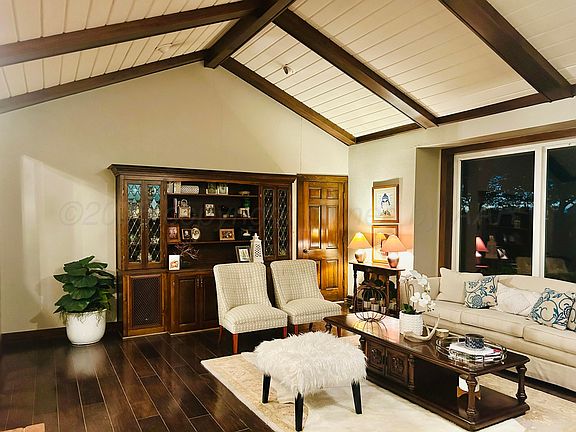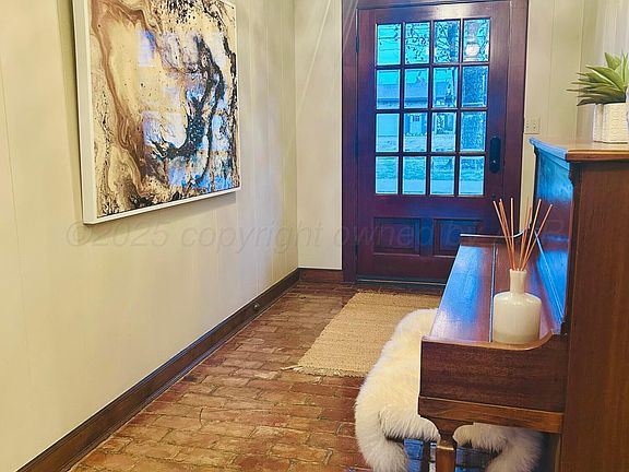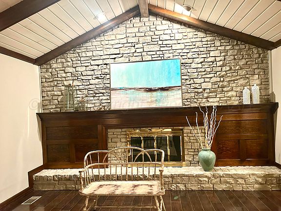 Inside you'll find 3 spacious bedrooms, 2.5 bathrooms, a dedicated office, and both formal living and dining room. The formal living room is a showstopper with its vaulted, beamed ceilings, massive picture window, and beautiful stone fireplace that creates an inviting, lodge-style atmosphere. The kitchen and bathrooms offer high-end touches. Throughout the home you'll find crown molding, upgraded finishes, and thoughtful craftsmanship. One of the standout features is the antique brick flooring, salvaged from the old Higgins schoolhouse—bringing character and history into the home.