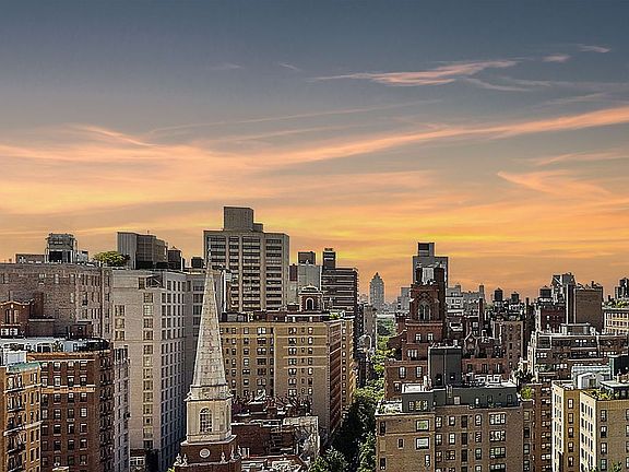There is an expansive, light-filled primary suite with a sitting room. It features three exposures with sweeping city views, two separate, en-suite bathrooms, and five substantial closets.