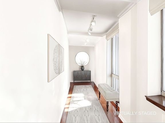 Exit the elevator onto a private landing. As you enter the apartment, you are welcomed home by an elegant, sunlit gallery with floor-to-ceiling windows that flows into a gracious foyer, with a closet for guests.