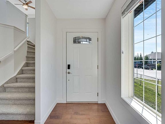 OPEN HOUSE Sat Oct 11th from 1pm to 3:30. Well-maintained 3-BEDROOM HOME with a SUPER FUNCTIONAL FLOOR PLAN and a DEVELOPED BASEMENT, offering 2228 SQFT OF LIVING SPACE. Ideally located just off the main road at the entrance to the community, the home sits in a QUIET POCKET WITH NO THROUGH TRAFFIC, backing onto GREEN SPACE & WALKING TRAILS—offering rare privacy and LAKE PRIVILEGES in a connected, amenity-rich location. The main floor features an OPEN-CONCEPT DESIGN with FRESH PAINT THROUGHOUT, NEW CARPET, NEWER ENGINEERED HARDWOOD FLOORING, a GAS FIREPLACE, and UPDATED LIGHTING. The kitchen includes NEWER APPLIANCES, ISLAND SEATING, and excellent storage with a LARGE PANTRY. As a CORNER UNIT, the home is filled with NATURAL LIGHT and offers added privacy, with no adjacent homes blocking the sun. The LIVING AND DINING AREAS connect seamlessly for both everyday living and entertaining. Upstairs, you'll find THREE BEDROOMS, including a spacious PRIMARY SUITE with a 4-PIECE ENSUITE and plenty of room for a KING-SIZED BED. A LARGE BONUS ROOM adds flexible space—perfect for a MEDIA ROOM, OFFICE, or PLAYROOM. The FULLY DEVELOPED BASEMENT offers a 2-PIECE BATHROOM, additional living space, and GENEROUS STORAGE. Enjoy outdoor living with a TWO-TIER DECK featuring a PRIVACY WALL and ENCLOSED STORAGE AREA BELOW. The LANDSCAPED YARD is designed for LOW MAINTENANCE and includes UNDERGROUND SPRINKLERS with DIRECT ACCESS TO THE GREEN SPACE. Additional upgrades include AIR CONDITIONING, a NEW ROOF WITH DRIP EDGE (2017), NEWER HOT WATER TANK, NEWER WASHER AND DRYER, and HUNTER DOUGLAS BLINDS. The HALF-BATH FEATURES HEATED FLOORING, and the home is PRE-WIRED FOR A FUTURE HOT TUB.