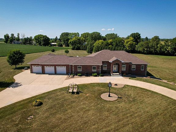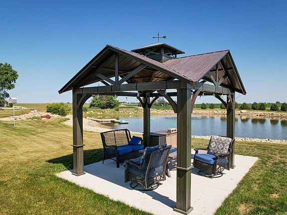 You’ll notice the fine care and attention to detail from the second you pull on to this finely manicured 8+/- acre property between Denver and Waterloo, Iowa. A fully concrete driveway will take you uphill along a line of maples lit by custom light fixtures to a stunning ranch style home with over 4,000 finished square feet! Look off to the right and you’ll see a beautiful pond with fountain, dock and outdoor hard topped gazebo. Walk inside this beautiful custom home and you’ll be greeted by a large great room with gorgeous, picturesque windows for plenty of natural lighting, an electric fireplace and 12’ high vaulted ceilings. No expense was spared in the construction of this 4 bedroom, 3 bath home. A brilliant cherry wood finish is present throughout the entire home from the baseboards all the way to the custom-built cabinetry in the kitchen and the lit built ins around the home. The large main floor master suite has features like a huge walk-thru closet with dual side entry, heated master bath floors, a fully updated tiled shower with a multi shower head system, two toilets, and large tub that overlooks the pond. You’ll fall in love with the size of the kitchen and the well thought out and designed features and layout. Stainless steel appliances, a cherry dining table with granite top matching the granite counters and endless storage and pantry space with roll out and pull-out shelving. Surround sound speakers are fully wired throughout most of the home including the basement. In floor heating through most of the basement keeps it warm in the winter months. Large walk-in closets are present in most of the bedrooms. A large main floor laundry room and main floor office, that could also easily serve or be used as a 5th bedroom or guest room, are nice touches on this already large main level floor plan. An attached 3 car garage can be entered from either the main level of the home or from the basement as well. For additional storage, make sure to bring your boat, lawn and plow equipment, tractor and other toys to store in the 30x32 steel building on concrete! Soak up the sun on the back porch or walk out basement concrete patio, or do some fishing with the family on the dock of the 1 acre stocked pond that has both an aerator and fountain and is very clean and finely maintained. This acreage just south of Denver and north of Waterloo would make for a quick commute to Waterloo, Cedar Falls, Waverly and the surrounding areas in the Cedar Valley! Showings are by appointment only with pre-approved qualified buyers. Don’t miss your opportunity to see this must-see property! Call to schedule your showing today!