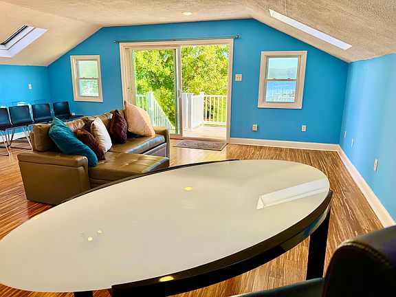 The main level features a spacious, light-filled professional office with stone-tile flooring, built-in cabinetry, a convenient kitchenette, half bath, and walls of windows overlooking the water. Step right outside to the paver patio a perfect setting to host clients, hold consultations, or simply enjoy a coffee break with a view. Upstairs, the private living area offers a comfortable bedroom, a full bathroom, a kitchenette, bamboo flooring, and a waterside balcony to take in the serene surroundings.