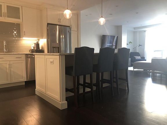 Luxury abounds at Elliott Landing. From your private residence with top line finishes to the welcoming lobby with seating and stone hearth, from the Essex Room with fireplaced lounge, with full kitchen, game, gym and media centers for larger gatherings and a garden court with outdoor fireplace and grilling stations, you are surrounded by comfort and luxury. Your home offers a large open concept plan with 2 bedrooms and 2 bathrooms filled with light from the floor to ceiling windows and hardwood floors running throughout the main living area including the kitchen, dining room, and living room. The dream kitchen includes beautiful granite counter tops, stainless steel GE appliances, a pantry, and a large expansive center island. A master suite with two walk in closets, additional bedroom with custom black out shades for maximum energy efficiency, and dedicated laundry space complete this home. Includes extra storage space in the building. Same floor deeded covered parking is included.