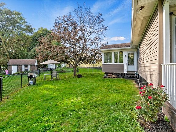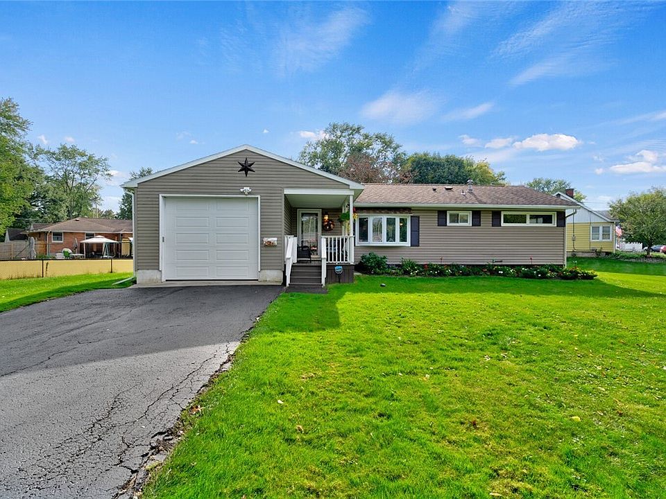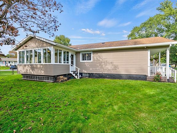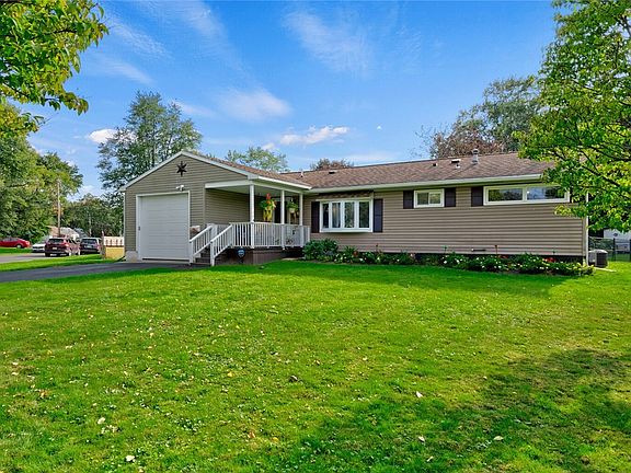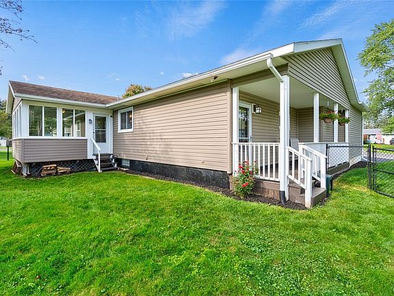 A ranch so good it's spooky! Resting in the Village of Minoa on a corner lot bordered by seasonal blooms and rustling leaves, this home welcomes your arrival. Entering through the covered front porch, craftsman style trimming pairs beautifully with warm hardwood floors, natural amber tones, and an open layout. Cozy up by the fireplace and host gatherings in a spacious great room outfitted with stainless steel kitchen appliances, a peninsula for additional counterspace, and natural light. The dining area flows into a bright sunroom with wall to wall windows accessible by a sliding glass door. Down the hall two bedrooms sit across from a full bathroom with walk-in shower. Utility of the oversized garage matches the convenience of an oversized mudroom featuring laundry, cabinetry, and storage. The meticulously maintained interior and exterior showcase a second covered side porch with steps leading to a fully fenced-in backyard and a bonus 475 sq. ft. of finished basement with a roughed-in half bath. Updates include mechanicals, landscaping, and fresh paint. A turn-key worth Falling for! Delayed Negotiations until Monday 10/2 at 6pm