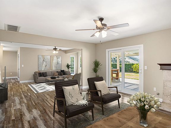 Perched on over half an acre in the hillside, this beautifully updated mid-century home offers endless potential and stunning panoramic views of the valley, surrounding hills, and distant mountains. With an expansive open-concept layout and thoughtful updates throughout, this home perfectly blends timeless character with modern style. Nearly every room captures the breathtaking scenery, creating a serene and inspiring atmosphere. Entertaining and daily living is effortless with separate family, living and dining rooms. The kitchen encourages your inner chef to emerge and create culinary delights with stainless steel appliances and plenty of counter and cabinet space. All bedrooms are upstairs and enjoy a split bedroom floor plan, placing the primary bedroom on one side of the home and the secondary bedrooms on the other adding extra privacy and personal space. All bathrooms have been updated with modern flair and an eye for design. Direct access to the two car garage adds convenience.The adjacent land gives this property an abundance of options such as a pool, ADU, tennis or pickleball court, or garden with no HOA to limit your dreams. Truly one-of-a-kind and easily the standout property on the street—this is hillside living at its finest. Don’t let this opportunity pass you by!