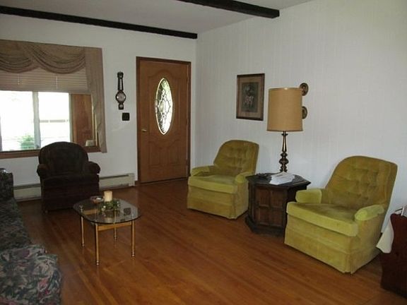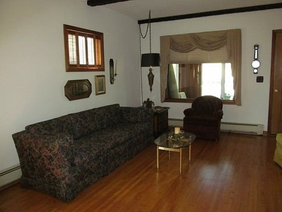 Meticulous 4-bedroom Bungalow. Enclosed front porch; Hardwood flooring in the combination living room/formal dining room; Natural woodwork; Unfinished full basement; Upper bedroom has adjoining 15x15 sitting room; Vinyl siding; Hydronic heat; Range, refrigerator, microwave, washer, dryer, freezer in basement; and all window coverings are included. A one year Home Warranty is also included.