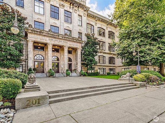 Live the ultimate Seattle lifestyle in this iconic Queen Anne High School condo with breathtaking city views! This one-of-a-kind home blends 1908 historic charm with modern updates - soaring ceilings, original windows, and rich hardwood floors. The airy loft bedroom and open living space are bright and inviting, with fresh paint and carpet (2024). Enjoy a stylish kitchen with stone counters, stainless steel appliances, generous storage, and island seating. Watch sunsets over the Space Needle, skyline, and Elliott Bay from the rooftop deck. Includes parking near the door, storage, secure delivery, and pet-friendly amenities (2 pets). NO RENTAL CAP -perfect for owners or investors. Steps to cafes, shops, and transit—urban living at its best!