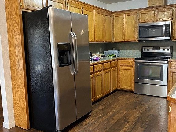 Nice all electric 3BR, 2 bath brick home, new roof in 2024, ceramic tile and wood laminate flooring, nice kitchen with all appliances included, 2 car garage plus a 1 attached car garage, above ground pool with gazebo, storm shelter, fenced back yard