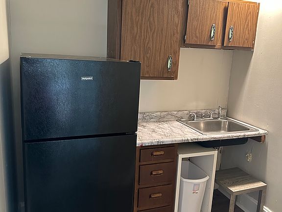 Small Kitchen with a full refrigerator, cabinets, sink, **Note** No stove in this unit , this is a small studio kitchen with no room for a stove to be added. There is a provided microwave and griddle.
