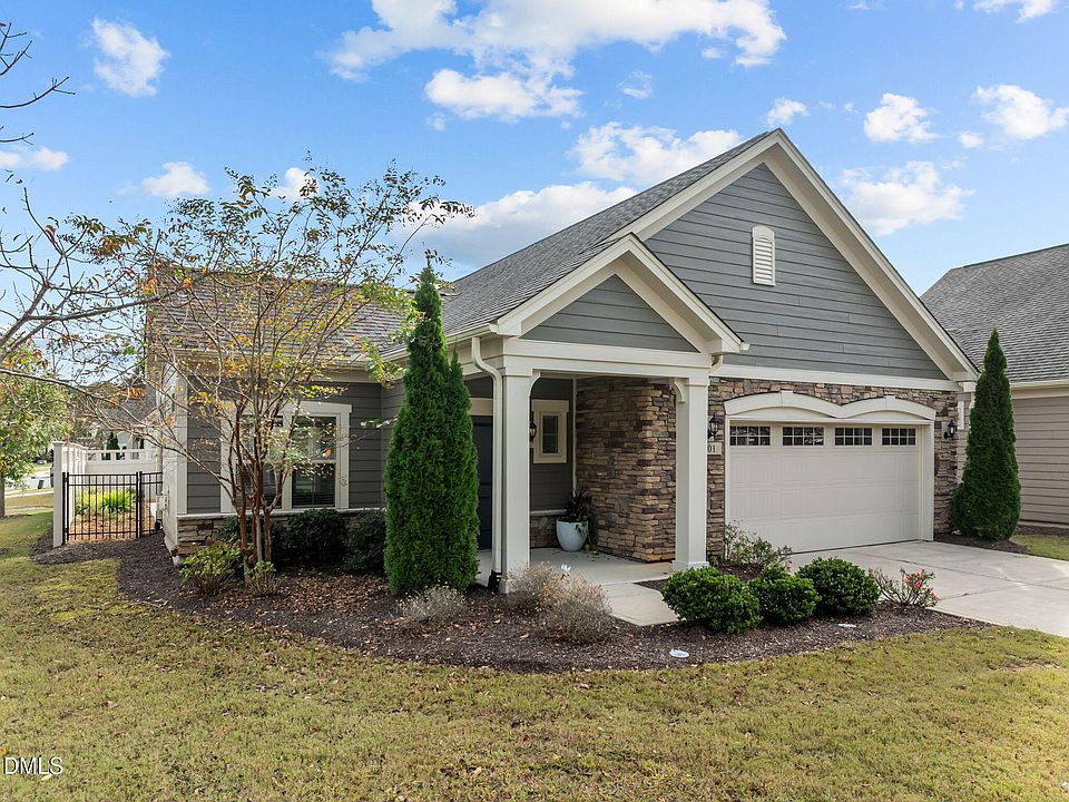 Step into a home that feels as good as it looks! This beautiful two bedroom, two bath home combines low maintenance living with an active, connected lifestyle in one of Chapel Hill's most loved active adult 55+ communities. Residents rave about the forest views, friendly neighbors, and the endless ways to get involved from cooking and gardening to hiking, fitness, travel clubs, and water aerobics by the pool. Inside, warmth and style blend effortlessly with hardwood floors, a gas fireplace, and a bright, open layout that's perfect for gatherings. The kitchen features sleek quartz countertops, soft close drawers, stainless steel appliances, and a gas range for the home chef. The primary suite is your personal escape, complete with a tray ceiling, walk-in closet, and spa-like shower. With a spacious laundry room, two car garage, and an inviting fenced patio, every detail is designed for comfort. You'll fall in love with the lifestyle here where every day feels both peaceful and connected.