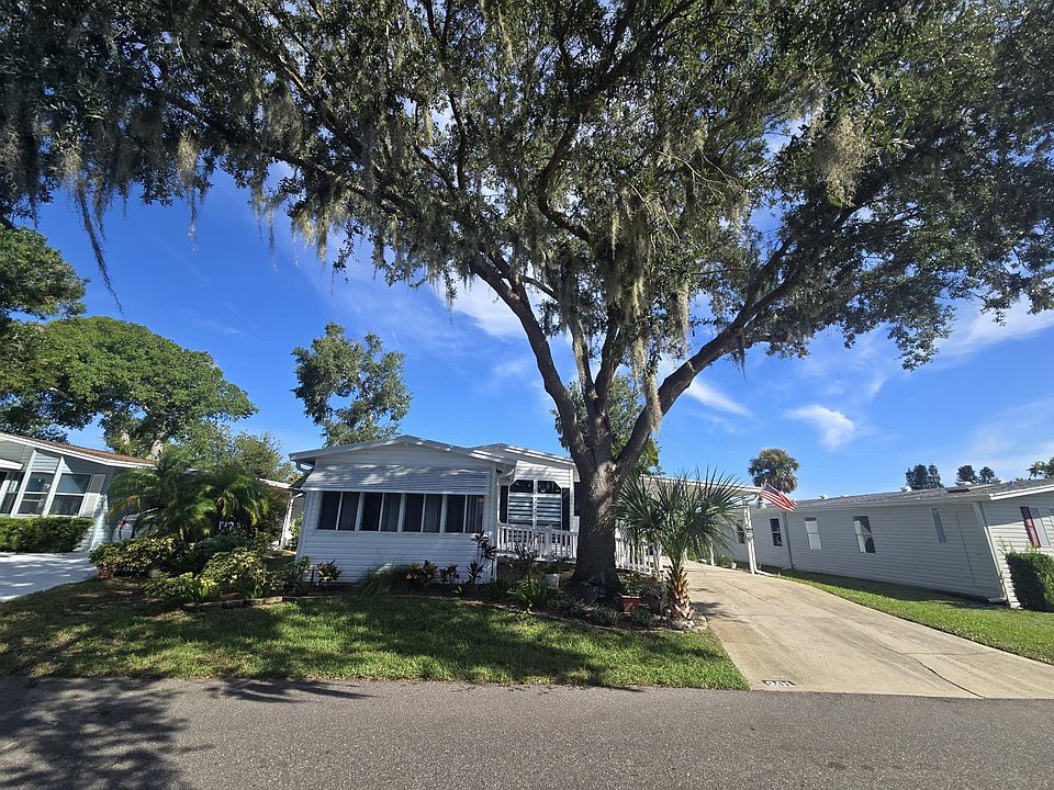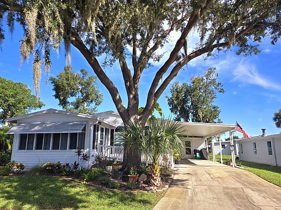 LOCATED IN BEAUTIFUL HACIENDA DEL RIO, A 55+ COMMUNITY! Step into this beautifully updated 2-bedroom, 2-bathroom Palm Harbor home, where comfort and style blend seamlessly. The roof is BRAND NEW and all the screens on the house have been replaced. The warm tones of luxury vinyl flooring greet you in the all-season room and flow throughout the home, creating a cohesive and inviting atmosphere. Both bedrooms boast premium upgraded carpeting, enhancing the cozy ambiance, while refreshed baseboards add a modern touch. The spacious kitchen is a chef s dream, featuring ample counter space, a double sink, and abundant cabinetry with convenient chrome slide-out shelves. A charming dining nook by the window offers the perfect spot for morning coffee, complemented by a pantry closet and a built-in desk for added functionality. Enjoy the benefits of a redesigned laundry room, now featuring a utility sink and storage cabinets, with exceptional woodwork that adds character to this newly improved space. Modern upgrades include new nickel hardware, doorknobs, handles, and hinges, along with stylish ceiling fans and light fixtures throughout. The home s Zebra blinds provide an elegant touch while ensuring privacy and light control. For added accessibility, a ramp leading to the all-season room offers easy entry, while the 12x14 storage shed with electricity is perfect for home projects. Plus, there s a dedicated space for storing your kayak in the back, making this home ideal for both relaxation and adventure. There is irrigation to help take care of the wonderful fruit trees in the backyard. Don t miss out on this exceptional property schedule your private showing today!