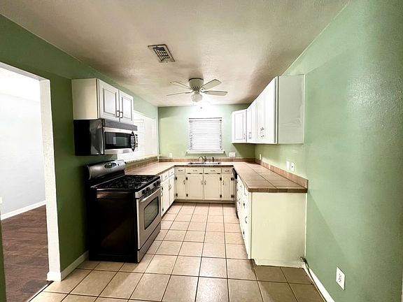 Move-in ready home available for rent! This freshly painted 3-bedroom, 2 full bath house features all tile flooring for easy maintenance. The primary bedroom offers a walk-in tiled shower and closet, while the hall bathroom has been modernly updated. Situated on a corner lot, it provides ample yard space. Enjoy your morning coffee under the covered back porch. The backyard is divided by a chain link fence, perfect for gardening and family activities Deposit and First month's rent is due at closing. No smoking allowed inside the home. Small trained pets ok. Tenant is responsible for all utilities and yard maintenance.
