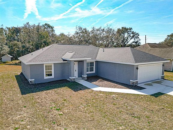 One or more photo(s) has been virtually staged. MOVE-IN READY! This brand-new, completed concrete block home with stucco offers a split-bedroom, open floor plan and a 2-car garage with durable epoxy flooring. Enjoy the reliability of public county water that continues running even during power outages. Conveniently located near main roads for easy access to schools, restaurants, shopping, parks, and golf courses—all with NO HOA. An easy commute to Ocala, Lake Weir, Belleview, and The Villages. Featuring 1,495 sq. ft. of heated living space, this home includes luxury vinyl flooring throughout, granite countertops, and a spacious master suite with a tiled walk-in shower and large walk-in closet. Situated on a 0.30-acre lot, the property offers plenty of space for a future pool and comes complete with a newly installed vinyl fence. Enjoy affordable living in Marion County, Florida, and make this brand-new home yours today!