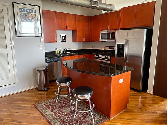 Sun-lit, fully furnished loft with exposed brick walls, wood floors and high ceilings, north-facing views of Buffalo Bayou. Open plan, modern kitchen with bar seating. Giant walk-in closet, dual shower, and in-unit washer and dryer. Steps from the Preston Light Rail stop and 2 blocks from Market Square and Buffalo Bayou multi-use trail. Unit includes covered parking space and bike storage area. Roof deck with views of downtown skyline. All utilities except for electricity included in monthly rent. Cleaning lady once a month also included. Discounts available for med center workers.