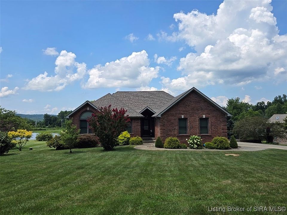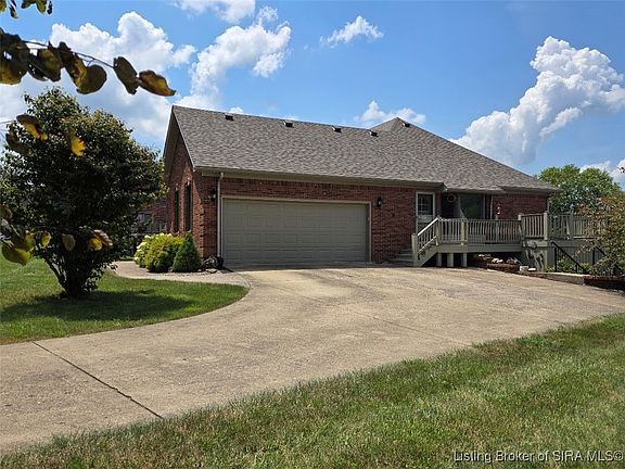 Money Hollow Estates featuring a PRIVATE 3-ACRE LAKE for fishing, kayaking, and is surrounded by 8 custom homes. This QUALITY BUILT 3-bedroom (could be 4 or 5) 3- bath home features EXTRAS such as composite decking, new triple pane windows, tray ceilings, custom sound system throughout entire home with volume control in each room. The kitchen boasts 42" wall cabinets with under cabinet lighting and QUARTZ counter tops. The walk-in shelved PANTRY is 9' x 6'. Casual dining by the bay window overlooking one of the homes 2 decks or FORMAL DINING WITH SCENIC VIEWS of the lake and rolling hills. The circular floor plan allows access to the living room from the dining room or kitchen- perfect for gatherings. This room has a 16- foot vaulted ceiling, fireplace and steps out to the second deck with more views! Completing the first floor is 3 bedrooms and 2 full baths. The spacious master suite has a new step in shower and a large walk-in closet. DOWNSTAIRS is partially finished and has 2 large rooms (26'x19') which walk out to the lower-level patio. These large rooms offer potential for in-law suite, office, theatre room or fitness room. Additional storage rooms and 3rd full bath complete the lower level. The grade of the 1.25-acre lot offers NO WORRIES about water intrusion during heavy rains. This is a perfect home for someone who enjoys nature. Just off HWY 60 near 1200-acre Deam Lake State Park. 5 miles to Hubers and 10 min. to Hunters Station. NEW HVAC AND ROOF.