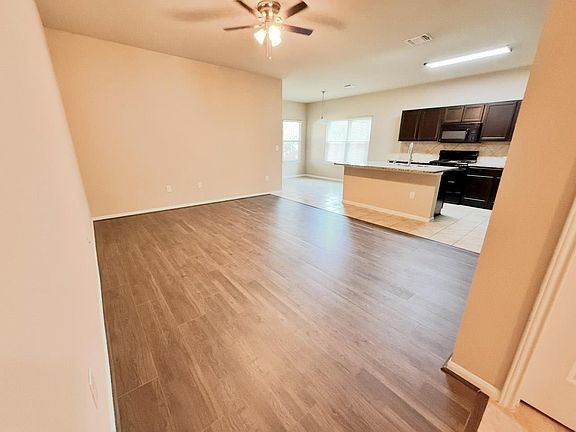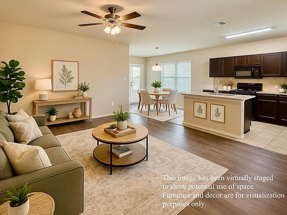 Extremely nice DR Horton home with open MIL floor plan, kitchen island, granite counters, and front & back covered porches. 3.25% FHA mortgage is assumable. Brand new plank flooring in living and carpet in bedrooms/hall/closets. Shingles replaced in July, 2025. Community landscaping on one side means there is only one side neighbor. Green space behind the property also means that the back neighbor is not close. New dishwasher. Washer & dryer convey. Fridge conveys if desired, but ice-maker is turned off due to slight leak at end of dispenser. Backyard fence is part stone & part wood. Well-maintained, quiet neighborhood with good proximity to services, schools, and major roads. Neighborhood playground right down the street.