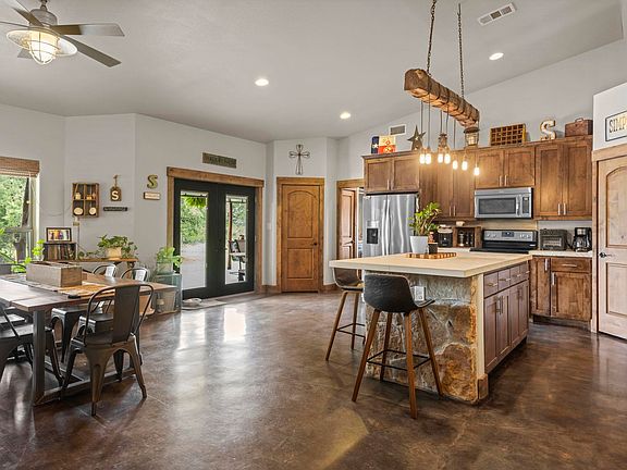 Experience the best of country living with this custom-built sandstone rock ranch home on 4 serene, oak-covered acres. Thoughtfully designed with rustic charm and modern comfort, this 3-bedroom, 2-bath retreat offers an open-concept layout, durable concrete flooring, and the cozy glow of a wood-burning stove—perfect for quiet evenings at home. Life outdoors is equally inviting. Start your mornings on the wide covered porches, take a dip in the sparkling in-ground pool, or simply enjoy the privacy of your fully fenced property with an automatic gated entrance. A new metal roof, sprinkler system, and an exceptional water well delivering 75 gallons per minute ensure peace of mind and easy upkeep. For those who need space to create or work, the 1,200 sq ft shop—with a full bathroom—offers endless possibilities, whether for hobbies, a home business, or extra storage. With its combination of seclusion, natural beauty, and functional amenities, this property is perfect for anyone seeking room to spread out while staying connected to nearby conveniences. Schedule your showing today!