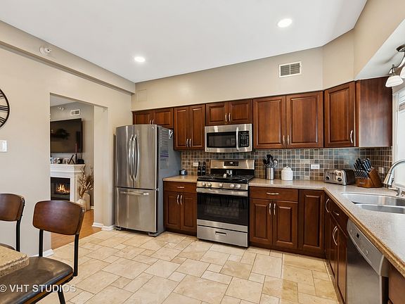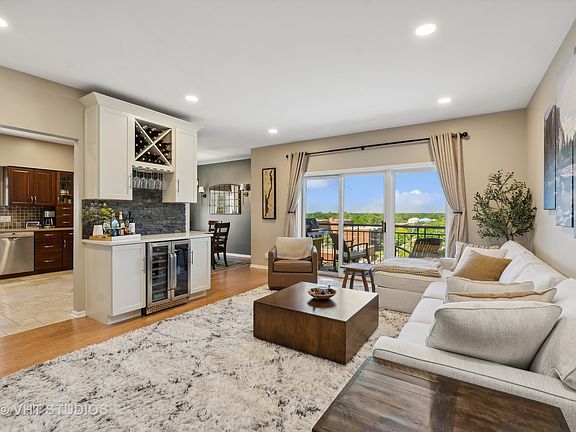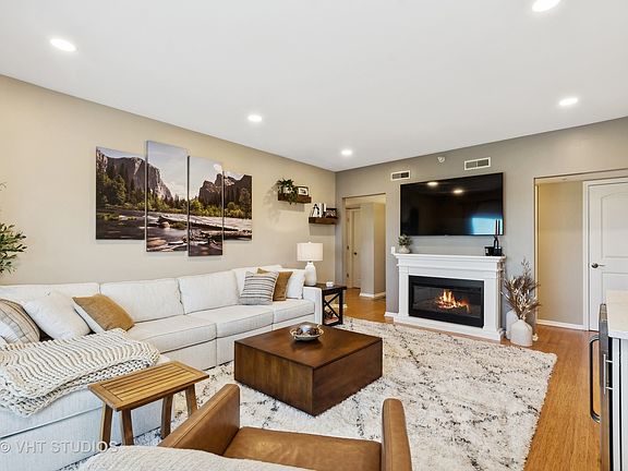 Penthouse living in Towne Place condos in Arlington Heights. This 2 bedroom / 2 Bathroom is just steps to all the action that downtown Arlington Heights offers. The 8 ft ceilings, large windows, and sliding door, allowwonderful natural light. The condo faces South and West, adding to the charm and beauty of the living space and incredible sunsets in the evenings overlooking downtown from your large balcony off the living room. Built-in custom bar with beverage fridge and wine storage make it easy for entertaining. New wood flooring in the family and dining rooms, as well as the hallway. Recessed lighting throughout the unit. The kitchen and laundry area have beautiful marble flooring, while the stainless steel appliances, soft close cabinetry and vented range hood are perfect for the chef. Enjoy the breakfast bar for morning coffee or homework. Master bedroom with jacuzzi tub, separate shower and plenty of storage in the walk in closets. 2nd bedroom with great closet space and light. Updated hall bath and spacious laundry room with additional storage. 2021 A/C system and new washer and dryer units. With both radiant and central heating, as well as an electric fireplace in the living room, you can stay cozy all year round. Elevator building with indoor heated garage parking and extra storage closet in front of spot for convenience. Easy street parking for guests in the area Arlington Metra station is across the street and all the boutiques , restaurants and entertainment this incredible town has to offer are just steps away. Walk to the Jewel Osco when you exit the Metra. The building offers a common patio and rec room on the 2nd floor, a great way to meet other residents. Gas and water included in the assessment. Garage space #6. ALL owner occupied units and no pets please. Hersey HS and 10/10 on the walk score!