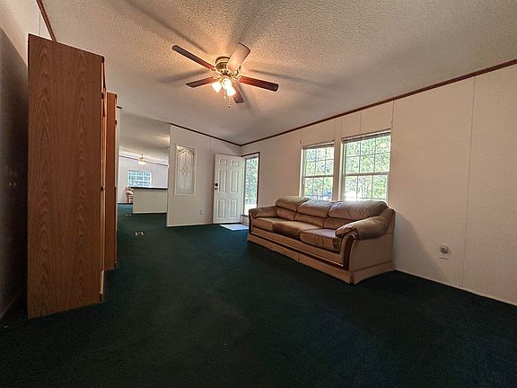 Nestled on 6.36 wooded, flat acres, this spacious double-wide offers both privacy and potential. The home features 3 bedrooms and 2 full bathrooms, including a primary suite with ample closet space. The open floor plan includes a comfortable living area, a dedicated laundry room, and a functional kitchen ready for your personal touch. Enjoy your morning coffee or unwind in the evenings on the covered wooden deck, perfect for relaxing and taking in the serene surroundings. With new carpets and a fresh coat of paint, this home could shine like new again. Ideal for those seeking a peaceful retreat with room to grow. Don't miss this opportunity to make it your own!