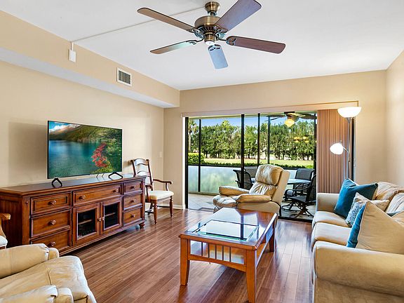 This first floor, immaculate and move-in ready condo is located on the 8th hole of the Golf Club of Jupiter. It features two bedrooms, two full baths and two walk-in closets. The kitchen boasts custom cabinetry, granite countertops and upgraded stainless appliances. Spacious, open concept living room and dining area complete with wet bar and wine cooler open to large screened porch with beautiful views of pond and eighth green. The unit has hurricane-proof windows and accordion shutters for the porch. New air conditioning was installed in 2023 and hot water heater in 2022. The HOA fees cover water, sewer and cable. Renting is permitted after one year of ownership. Residents can enjoy golf, tennis, pickleball, heated pool and clubhouse all surrounded by beautifully manicured grounds