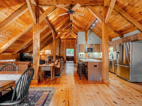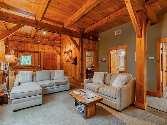 Timber frame homeSweeping mountain viewsTwo-car garageKnotty pine interiorsFlex roomExposed timber beamsOpen kitchen