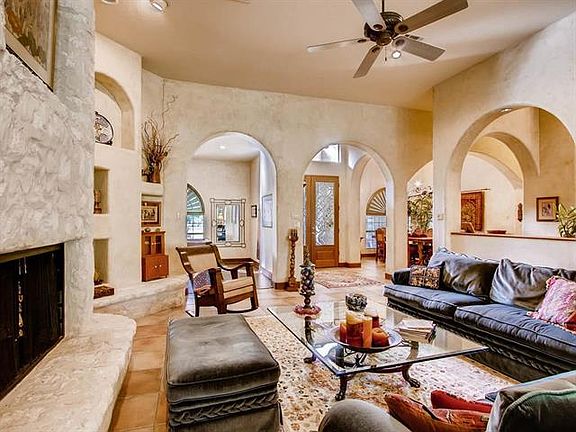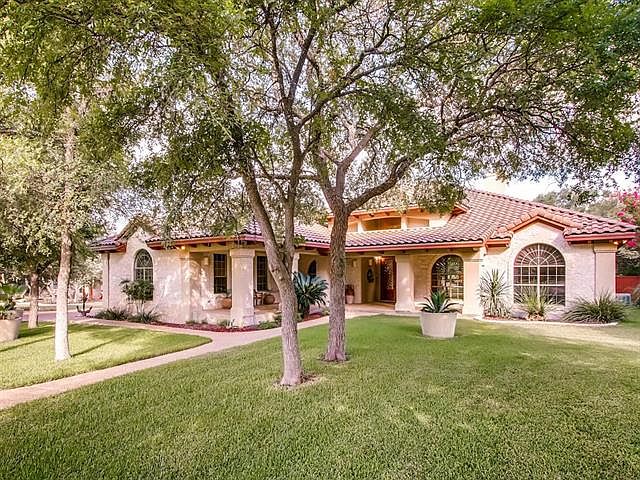 Unique home with amazing features, builder's personal home. Tile roof, amazing construction. 3 bedrooms w/study, game room, 2.5 baths. Rustic but elegant with rounded interior corners, hand trowel walls with built in's. Custom cabinets throughout. Stained wood molding, tile floors. High ceilings with recessed lighting. Huge gameroom with arched windows. Built in appliances in kitchen with open concept to living, formal dining and breakfast. Expansive covered patios, private treed yard flanked by stream.