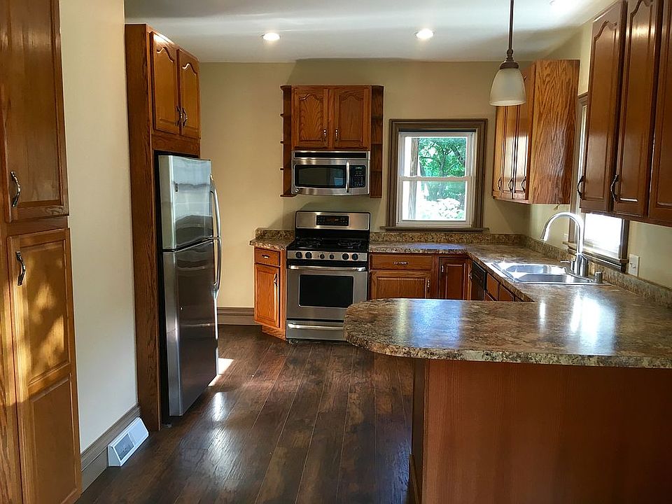 Classy all around! Spacious, newly remodeled kitchen complete with breakfast bar, stainless steel appliances and separate dining area. Newly remodeled bathrooms both with beautiful new floor and vanity. Large deck with stairs that lead to an additional, second story deck. All new carpet, fresh new paint. New roof, new furnace and new water softener (in 2010). Detached 2 car garage. Large fenced yard. Wonderful neighborhood close to schools and parks!