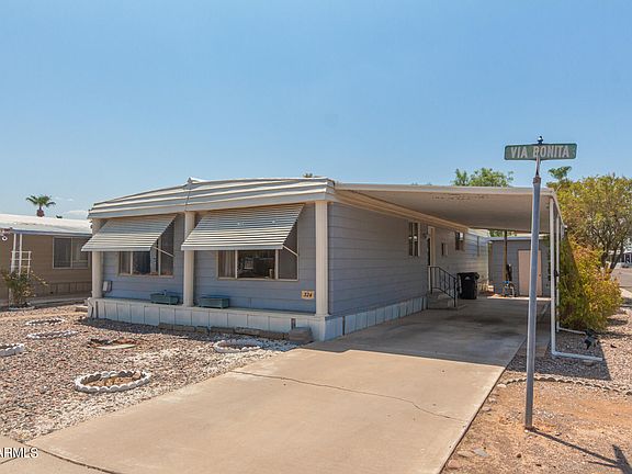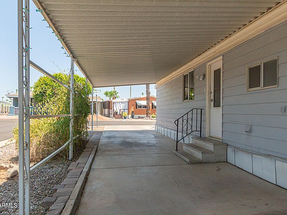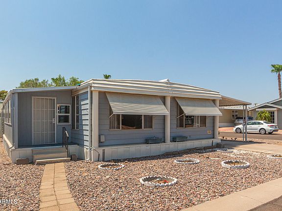 Discover this 2-bedroom, 2-bath manufactured home on a desirable corner lot! Venture into an inviting living room with a soothing palette and contemporary wood-look flooring. The eat-in kitchen is equipped with white cabinetry, a pantry, and essential built-in appliances for a seamless cooking experience. The main bedroom includes a walk-in closet and a private bathroom with dual sinks. Outside, you'll find an open patio for evening relaxation and 2 storage sheds for additional storage. The 55+ Community of Arizona Citrus Groves offers incredible amenities such as 2 heated refreshing pools, spa, recreation center, put-put golf, library, billiards room, shuffleboard court, fitness, picnic spots, laundry facilities, dog park, car wash area, and well-maintained common areas. Don't miss out!