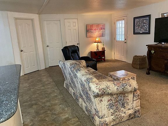 Lovely and spacious 3br/2bath Double Wide Mobile Home, situated on a very large corner lot. This provides for an abundance of privacy from neighbors. Inside you will find a 3/2 split configuration, which provides a very large family area. The Primary suite (approx 20x40) contains a large walk in shower. A second bedroom has its own Jack and Jill bath. The 3rd room is up to you. Bedroom, Office, Storage. Formal updated kitchen contains, stainless appliances and track lighting that sparkles off of the granite. Separate pantry and laundry room with access to awning covered parking and the 9x13 shed with power. Ceiling fans and white paneled doors throughout. New Carpeting, AC system condenser, capacitors and wiring replaced.
