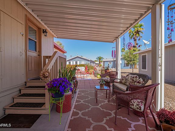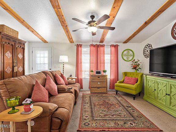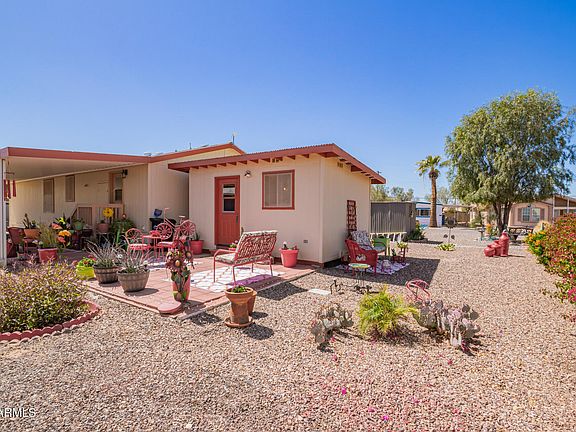 Welcome to this beautifully cared-for 2013 Cavco home, offering 3 beds & 2 baths, designed for comfort and ease in an active 55+ community. Recently painted in 2024, this home has been meticulously maintained, ensuring peace of mind for years to come. The A/C system has a maintenance contract & is serviced annually, as is the plumbing system, w/the hot water heater recently flushed. Additionally, the home was leveled 2 years ago, & a new vapor barrier was installed, keeping everything in top shape. This ground-set home offers easy accessibility & features a drip system to most plants, making exterior maintenance simple. The interior is warm & inviting, w/most of the furniture potentially included, making for a seamless move-in. The washer, dryer, & refrigerator stay, adding extra value. A standout feature of this property is the separate outdoor sauna studio, which includes a sauna and shower, along with additional space perfect for crafts, hobbies, or a personal retreat.