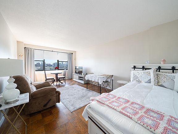 Walk into this large studio condo with breathtaking panoramic views of the city skyline and Hudson River. This condo offers an updated kitchen, hardwood floors throughout and plenty of closet space. This is a full-service Building with 24/hour doorman, elevator, laundry room, pool and playground and parking available for an extra fee. Steps away from Journal square path and public transportation!