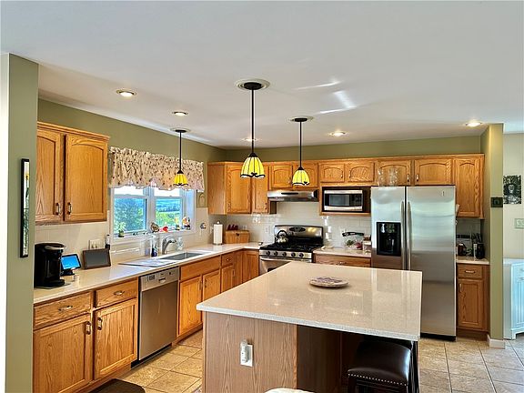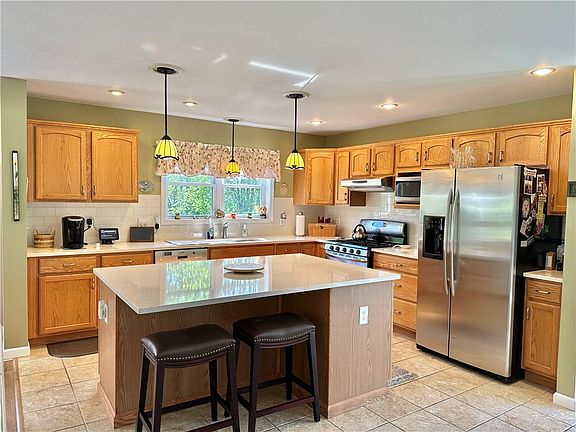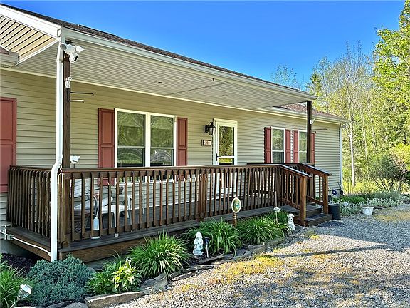Easy living in this well maintained 3 bedroom ranch with a large open floor plan between kitchen, living room, dining area with sliders out to wrap around deck where you can enjoy impressive sunsets while dining under the gazebo. Primary bedroom suite features a walk-in closet and full bath. Full unfinished basement with poured concrete walls and a large 2 car garage under the house, all temperature controlled, never have to get into a cold car. If that is not enough, a second temperature controlled 2 car garage with a 2 bedroom, 1 full bath accessory unit on the second floor for extended family or company to stay. Both kitchens feature quartz countertops and stainless steel appliances. Lots of storage space and closets throughout. Fenced in yard on a mix of open and wooded 5 acre parcel where wildlife, deer and turkey come to visit. Truely a find located at the end of the road. Call for your appointment today!