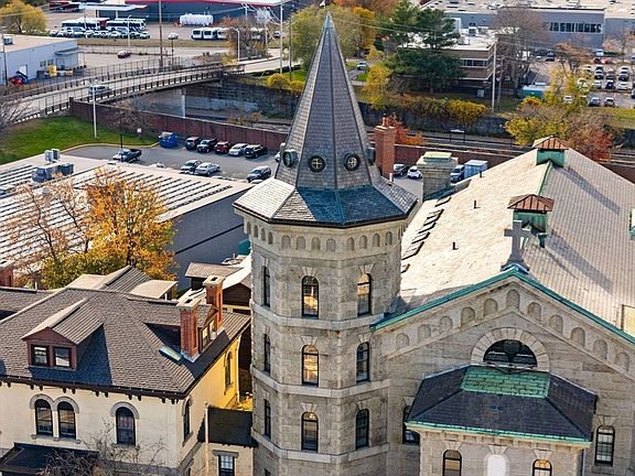 Welcome to The Keith Academy Condominiums, where history meets modern style in the heart of Lowell. This tri-level, 2-bedroom, 1-bath condo offers 1,185 sq. ft. of character-filled living space inside the converted steeple of a historic church. Step inside to soaring 15-foot brick ceilings, exposed beams, and large arched windows that flood the space with natural light. The granite and exposed brick walls blend timeless architecture with a cool, urban vibe. Enjoy a panoramic view that stretches all the way to the Boston skyline from your private catwalk. Recent updates include new flooring on the upper two levels. The building features an in-ground swimming pool and deeded parking. Located close to the train station, UMass, South Common Park, restaurants, and shops, this is a commuter's dream. Experience one of Lowell's most unique homes— historic charm with a modern edge.